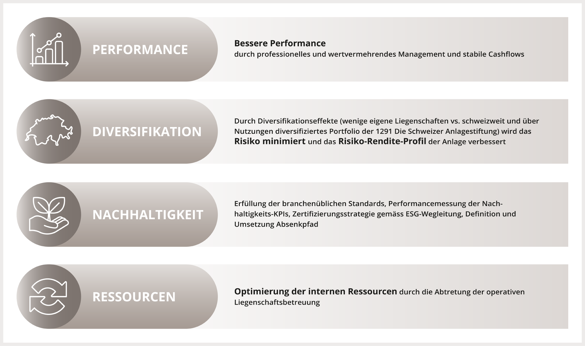 Die 1291 Die Schweizer Anlagestiftung investiert in Immobilien in der gesamten Schweiz. Neben Wohnimmobilien werden auch Immobilien mit anderer Nutzung wie Büro, Verkauf, Gewerbe und Logistik erworben. Im Vordergrund steht dabei eine angemessene Verteilung nach Regionen, Lagen und Nutzungsarten, mit Schwergewicht Wohnen. Die Auswahl der Standorte trägt insbesondere den Immobilien-Marktzyklen, der Wirtschaftskraft, den Konjunkturprognosen sowie dem politischen, rechtlichen und steuerlichen Umfeld Rechnung. Vor allem die Lage und Qualität der Immobilien sind von grosser Bedeutung, weil damit die Vermietbarkeit, die langfristige Ertragskraft und das Wertsteigerungspotenzial zusammenhängen. Alle Immobilien sollen wesentliche Nachhaltigkeitsanforderungen erfüllen und damit einen langfristigen ESG-Beitrag leisten.